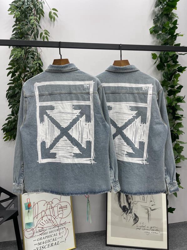 Denim shirt in bleached blue featuring negative arrows on the back. Button closure and pocket chest at front.